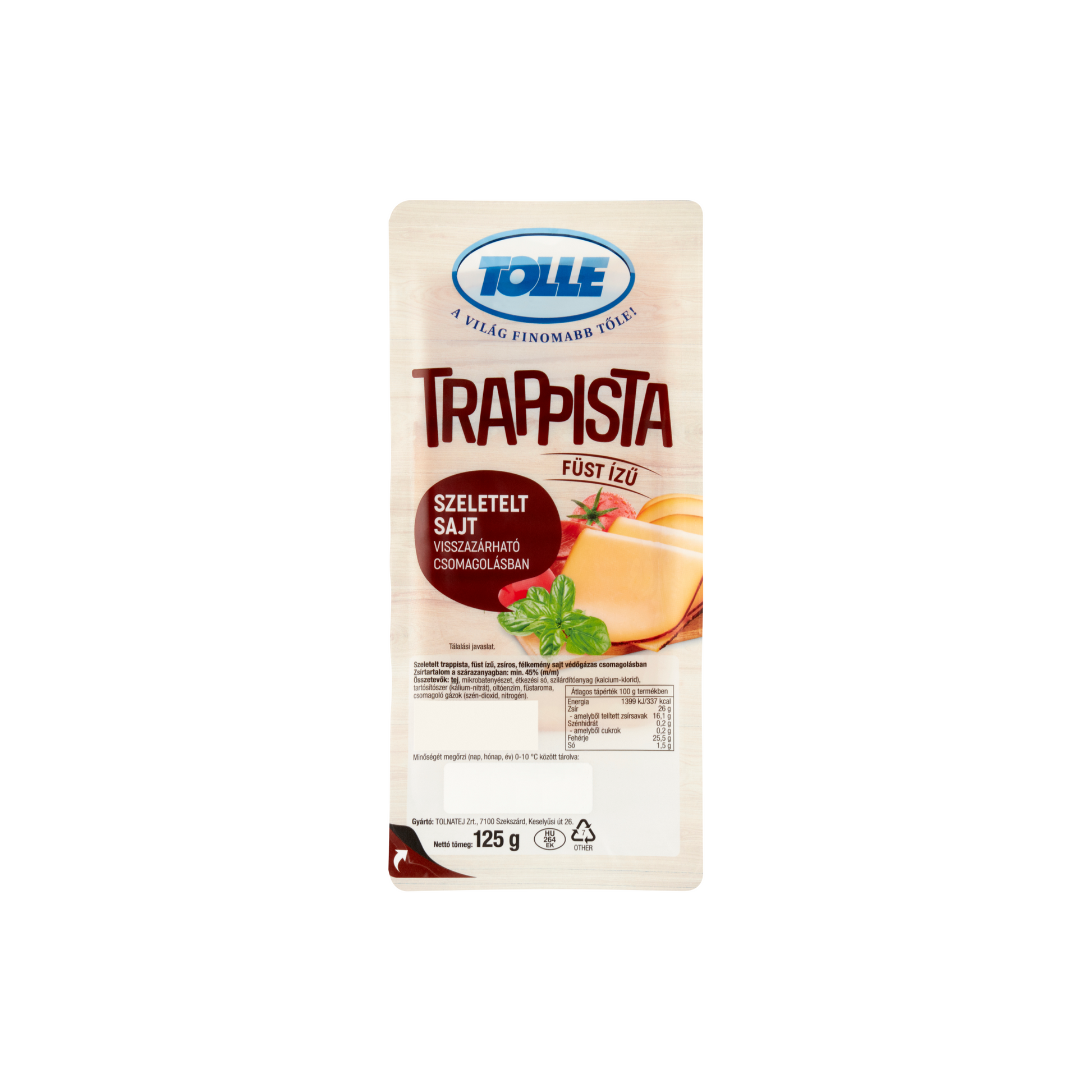 TermékjellemzőkSzármazási országMagyarországForgalmazóTolnatej Zrt. Szekszárd Keselyűsi út 26.Gyártó és/vagy élelmiszer vállalkozó telephely országMagyarországOltalom alatt álló eredet megjelölésNemOltalom alatt álló földrajzi jelzésNemMásodlagos márkaTolleLaktózmentesNemNemespenészNemSajt típusaFélkemény sajtSajt kiszerelés formájaszeleteltSajt fajtájaTrappista