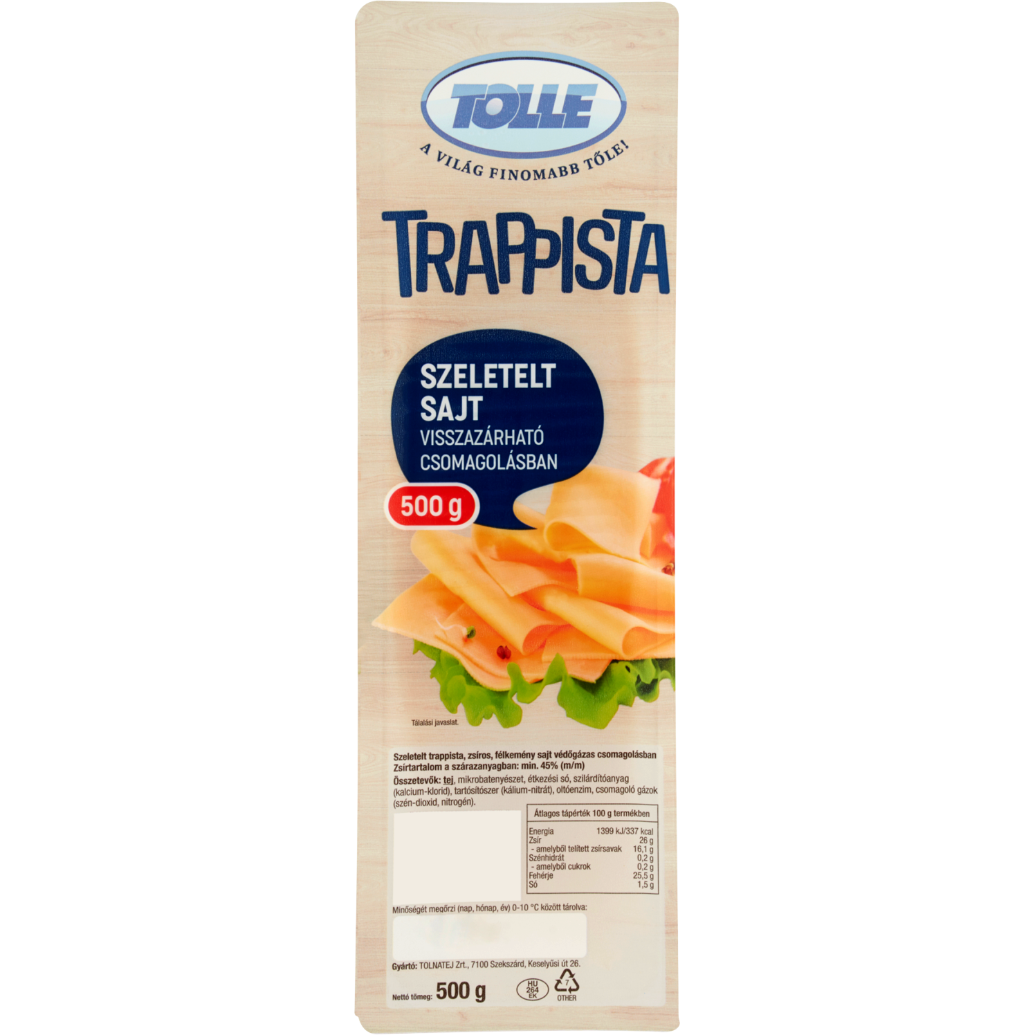 TermékjellemzőkSzármazási országMagyarországForgalmazóTolnatej Zrt. 7100 Szekszárd, Keselyűsi út 26.Gyártó és/vagy élelmiszer vállalkozó telephely országMagyarországOltalom alatt álló eredet megjelölésNemOltalom alatt álló földrajzi jelzésNemLaktózmentesNemNemespenészNemSajt típusaFélkemény sajtSajt kiszerelés formájaszeletelt, 500gSajt fajtájaTrappista